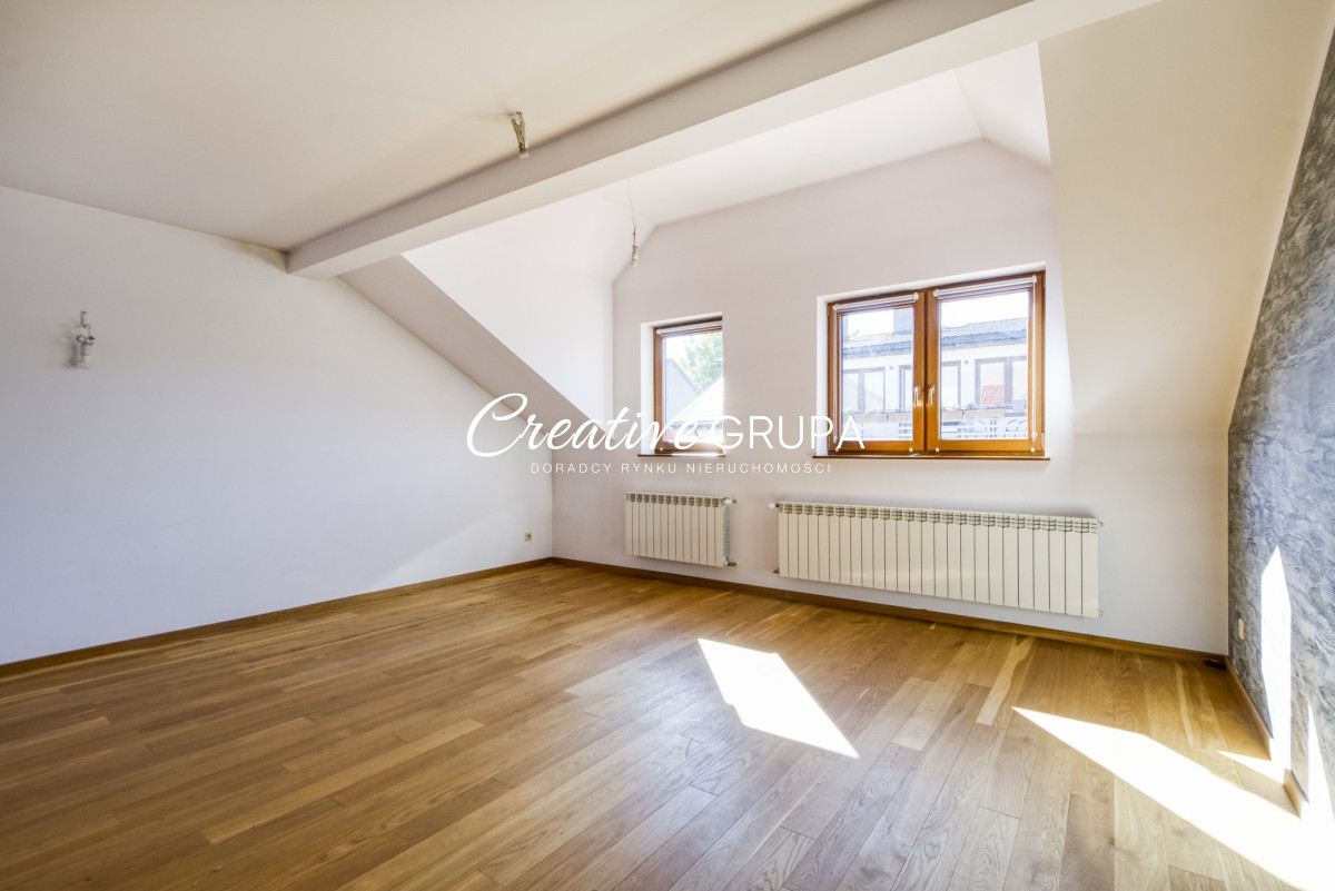 Podłogi w pokojach oraz schody wykończone są parkietem dębowym, natomiast w aneksie kuchennym zastosowano terakotę. Obie łazienki oraz toaleta są w bardzo dobrym stanie technicznym. Istotnym atutem nieruchomości są okna trzyszybowe. Dom wymaga jedynie lekkiego odświeżenia.