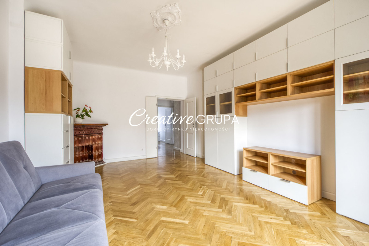 Salon z wyjściem na balkon jako centralna część mieszkania wychodzi na ciche i spokojne podwórko należące do wspólnoty. W pomieszczeniu są zachowane elementy wykończenia takie jak sztukateria, podwójne drzwi czy piękny kominek. pokój jest na bazie kwadratu i pozwala na wydzielenie części wypoczynkowej oraz jadalnianej.
