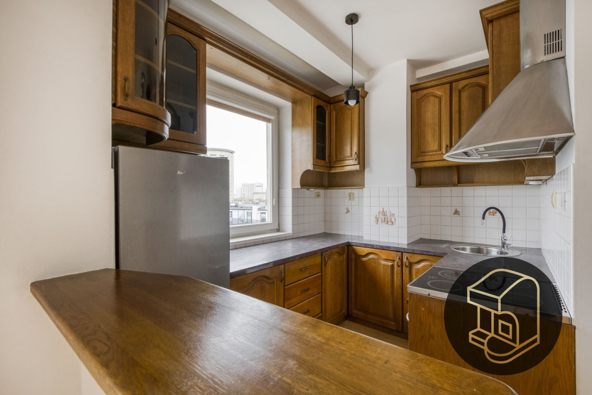 Kuchnia bardzo wygodna i słoneczna dzięki oknu. Zabudowa starszego typu, drewniana, wymaga odświeżenia. Bez problemu zmieszczą się niezbędne sprzęty AGD: lodówka, zmywarka oraz płyta elektryczna z piekarnikiem. W szafkach znajduje się wystarczająca ilość miejsca na kuchenne akcesoria. Kuchnię i salon oddziela wyspa kuchenna.
