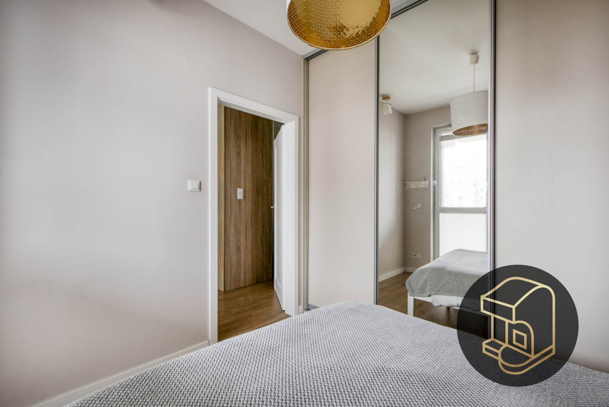 • Sypialnia z wygodnym podwójnym łóżkiem. Wbudowana szafa z drzwiami przesuwnymi, które mają lustrzane wykończenie, optycznie powiększają przestrzeń. Można zagospodarować miejsce do pracy.