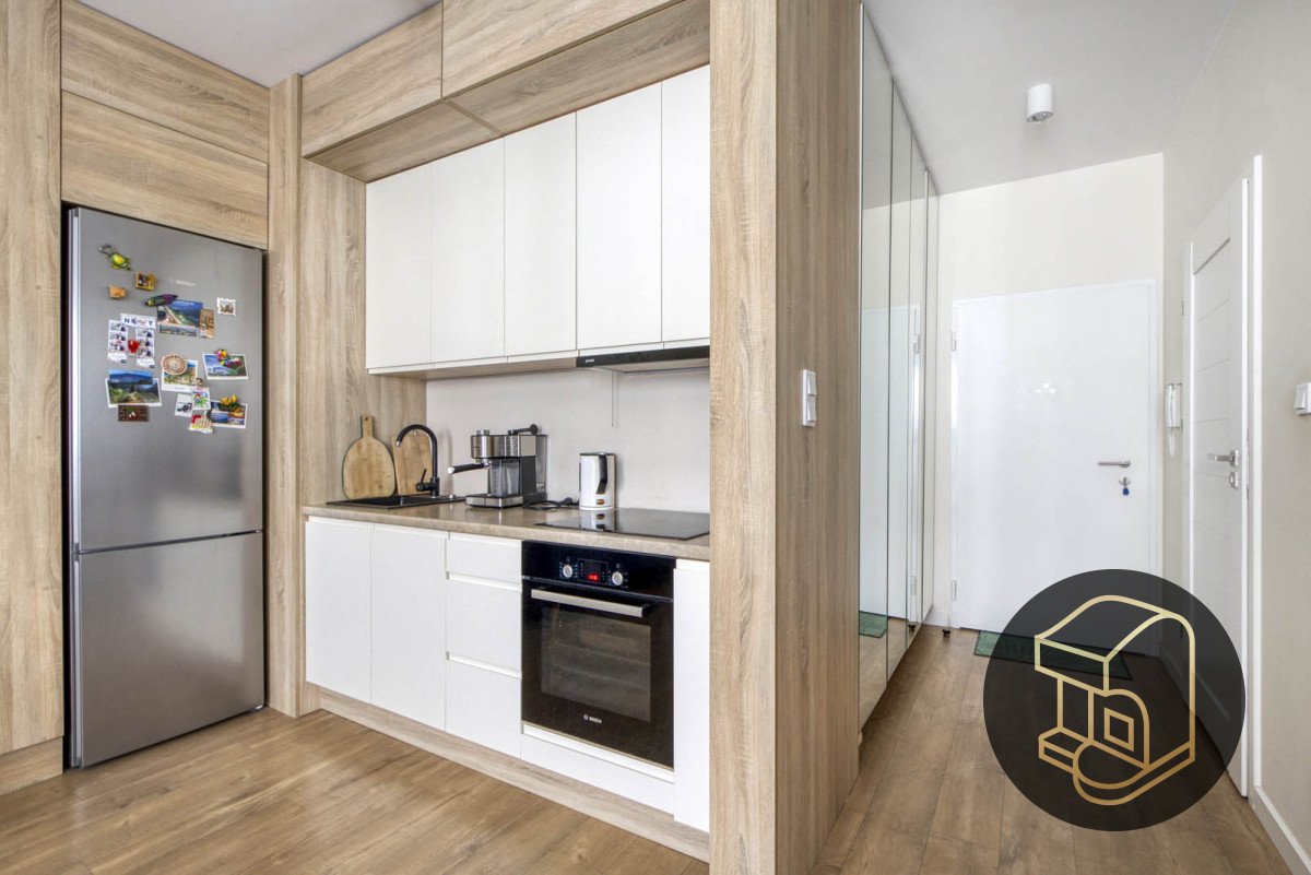 • Kuchnia z zabudową na wymiar oraz pełnym AGD - lodówka, zmywarka, płyta elektryczna