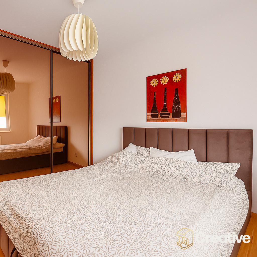Przestronna sypialnia pomieści zarówno duże łóżko, jak i meble dziecięce lub biurko do pracy zdalnej. To miejsce zapewnia ciszę i wygodę - idealne do wypoczynku.