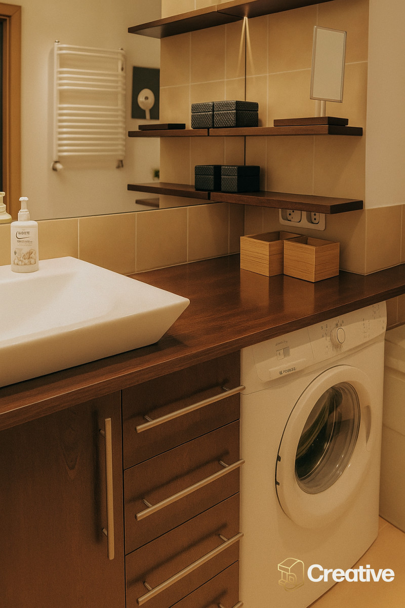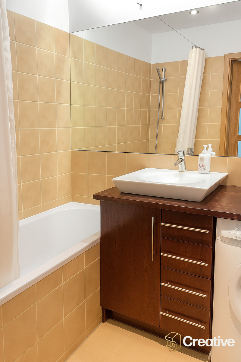 Łazienka z wanną z funkcją prysznica oraz pralką jest utrzymana w jasnej kolorystyce i spełnia potrzeby codziennej wygody całej rodziny.