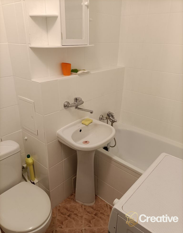• Łazienka z wanną oraz miejscem na pralkę, umywalką oraz wc.