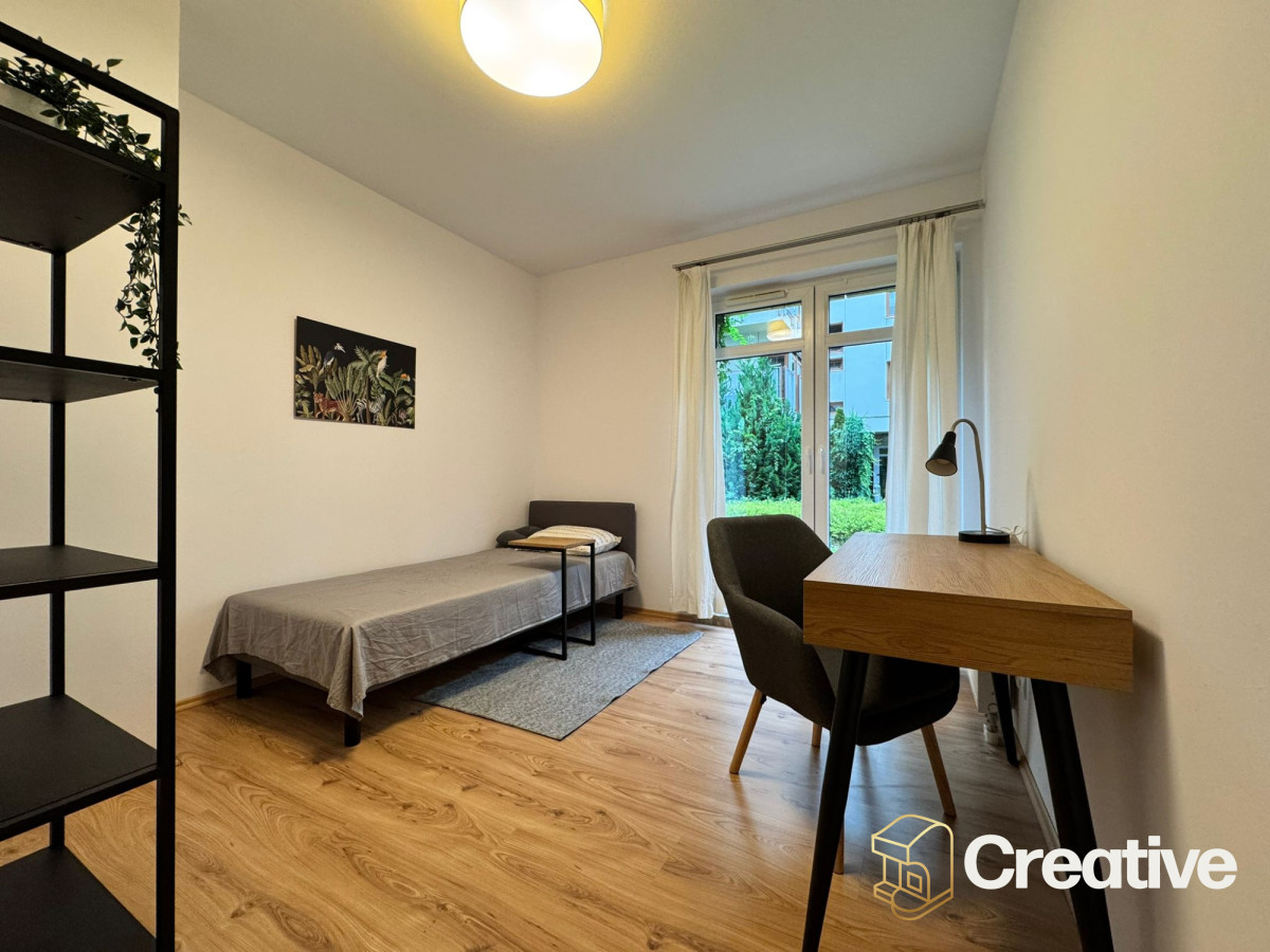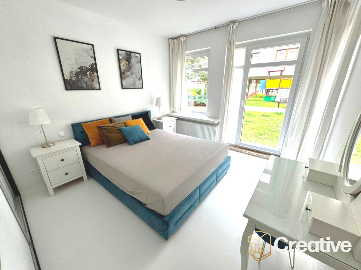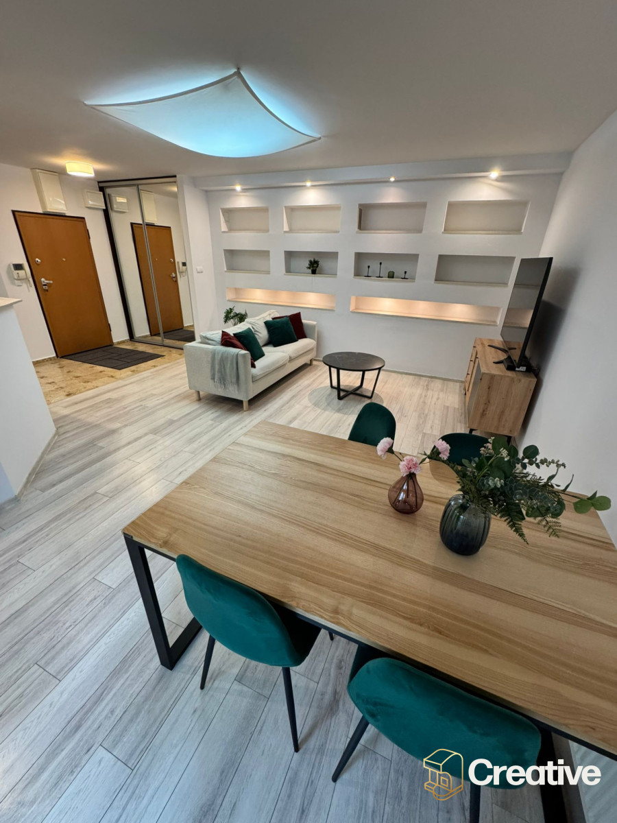 Nowoczesny, jasny i cichy apartament, wykończony materiałami wysokiej jakości. W pełni umeblowany i wyposażony w sprzęt AGD (lodówka, zmywarka, piekarnik, płyta indukcyjna, okap, pralka). Zabudowa meblowa na wymiar - funkcjonalna kuchnia z podwieszanym sufitem i oświetleniem punktowym, przestronne szafy z pawlaczem w przedpokoju i dużej sypialni, praktyczne rozwiązania do przechowywania. Łazienka z oknem mlecznym, ogrzewaniem podłogowym oraz dużym prysznicem z wanną.