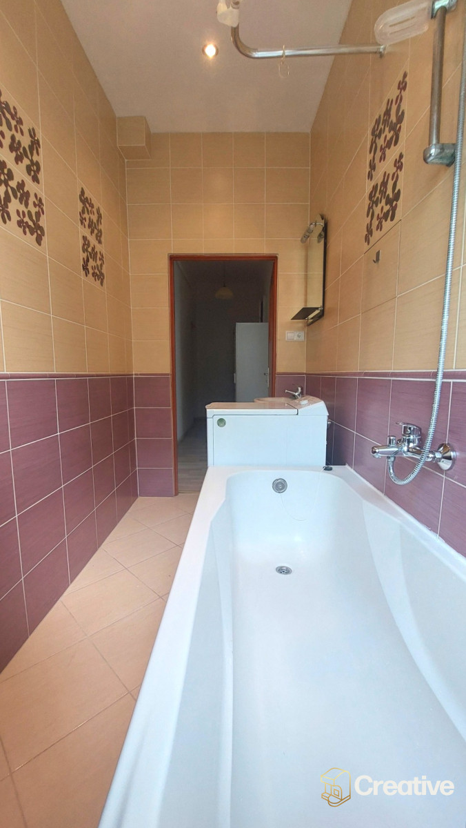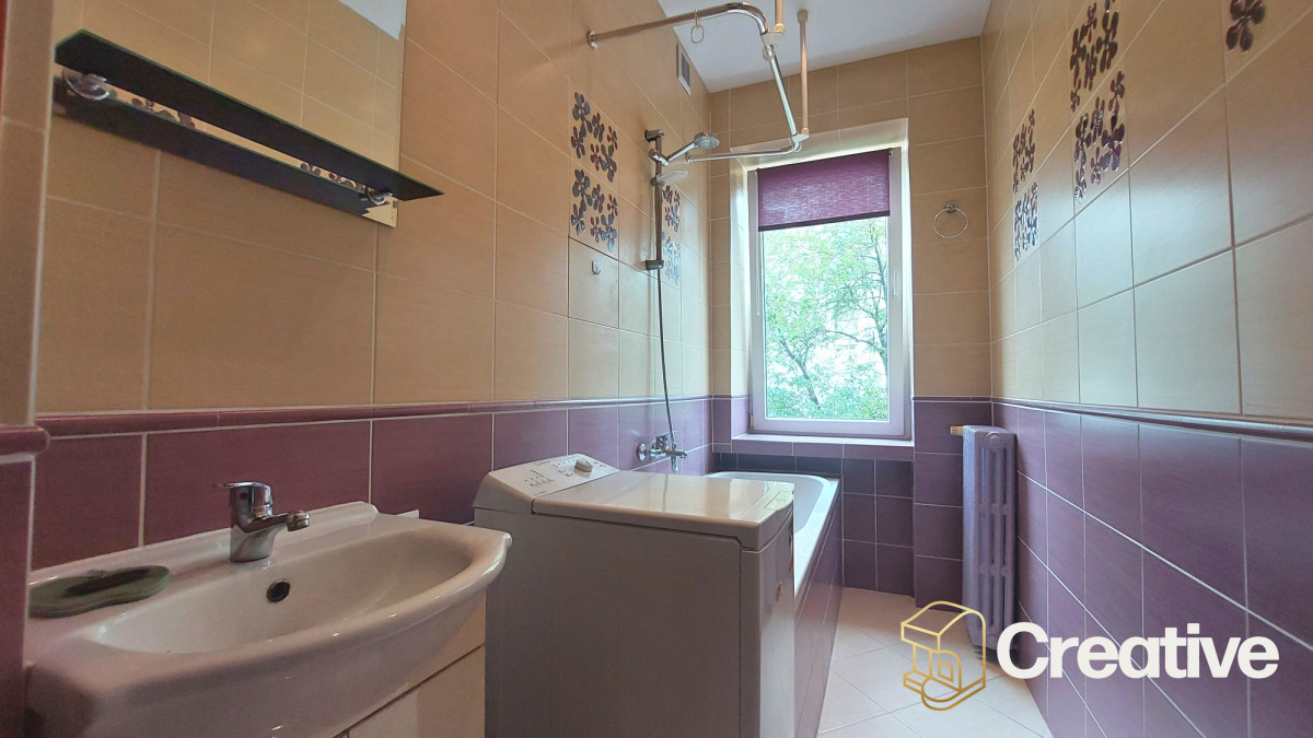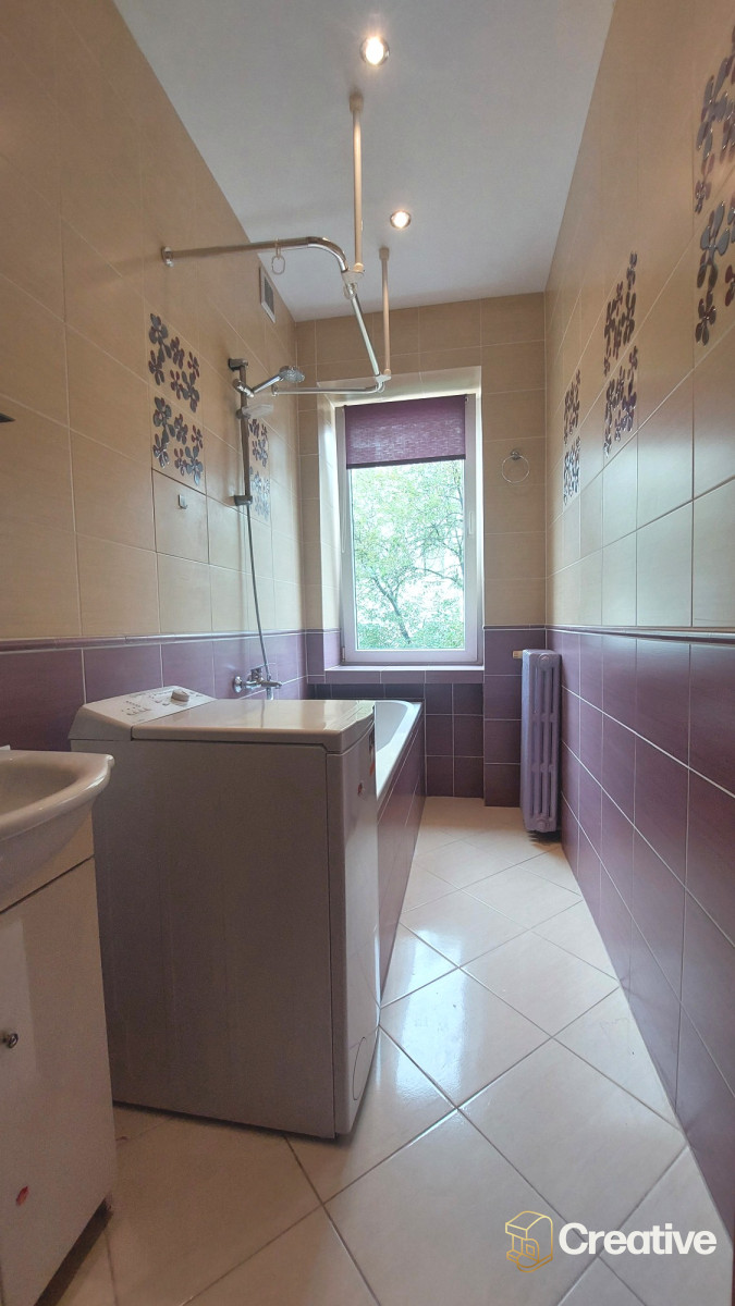 Łazienka z oknem - naturalne doświetlenie, wentylacja, wygodna wanna z funkcją prysznica i pralka - komfortowa przestrzeń do codziennego użytku.