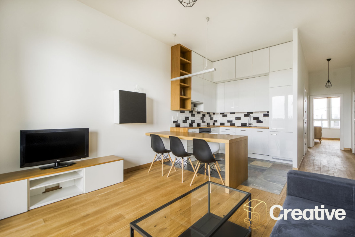 ⦁ Duży bardzo widny salon z aneksem kuchennym oraz wyjściem na dużą loggię