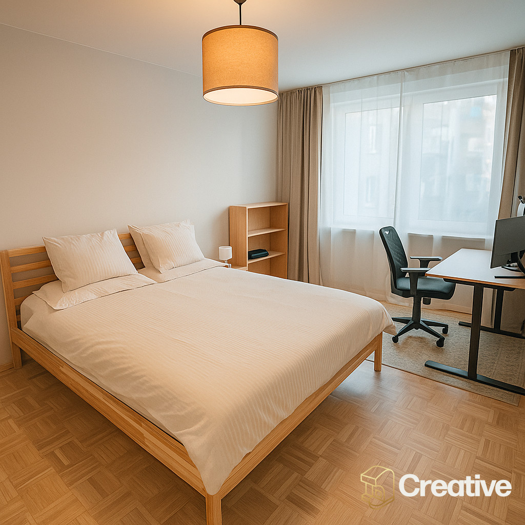 Druga sypialnia/gabinet/pokój dziecka - uniwersalna przestrzeń, którą dopasujesz do swoich potrzeb: wygodne łóżko, zabudowana szafa i biurko tworzą idealne warunki zarówno do pracy, jak i do nauki czy odpoczynku.
